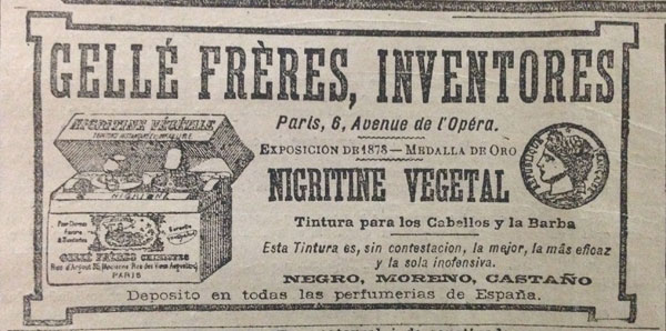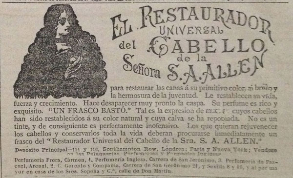 El restaurador universal del cabello de la Señora S.A. Allen. «Hace desaparecer muy pronto la caspa» y «no es un tinte, y de consiguiente es perfectamente inofensivo».