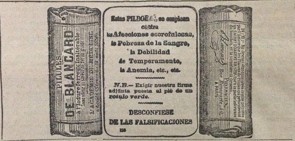 Pilules de Blancard. Contra la «pobreza de la sangre y la debilidad de temperamento». Y para que no compren otra marca advierten: «Exigir nuestra firma adjunta puesta al pie de un rótulo verde», «Desconfíese de las falsificaciones».
