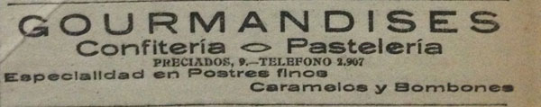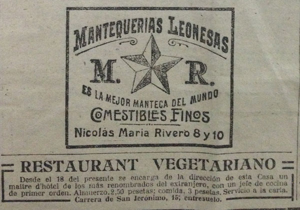 Dos anuncios. Mantequerías Leonesas, dos siglos después, continúa como una tienda de referencia en «comestibles finos» y embutidos de calidad. Abajo, un restaurante vegetariano, con un «maitre d’hótel de los más renombrados del extranjero y un jefe de cocina de primer orden», situado en la Carrera de San Jerónimo de Madrid.