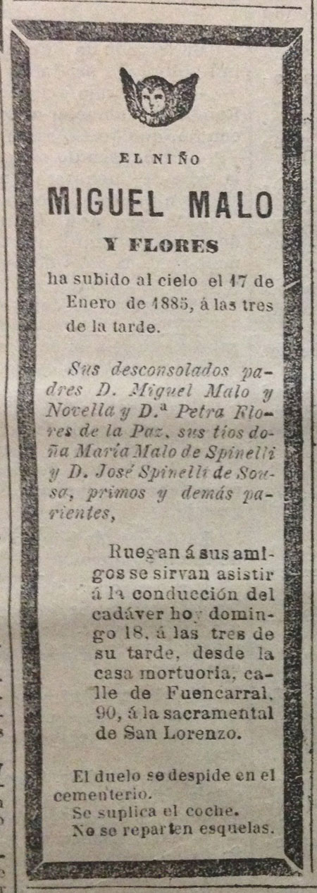 En El Imparcial se mezclaban anuncios y esquelas en la misma página, al final del periódico. El 17 de enero de 1885 el niño Miguel Malo subió al cielo y lo contaron así.