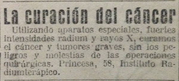 Cura del cáncer con «fuertes intensidades radium y rayos X» y «sin los peligros y molestias de las operaciones quirúrgicas».
