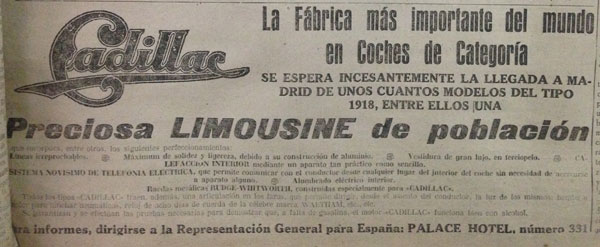 Cadillac. «Se espera incesantemente la llegada a Madrid de unos cuantos modelos del tipo 1918, entre ellos una preciosa Limousine de población».